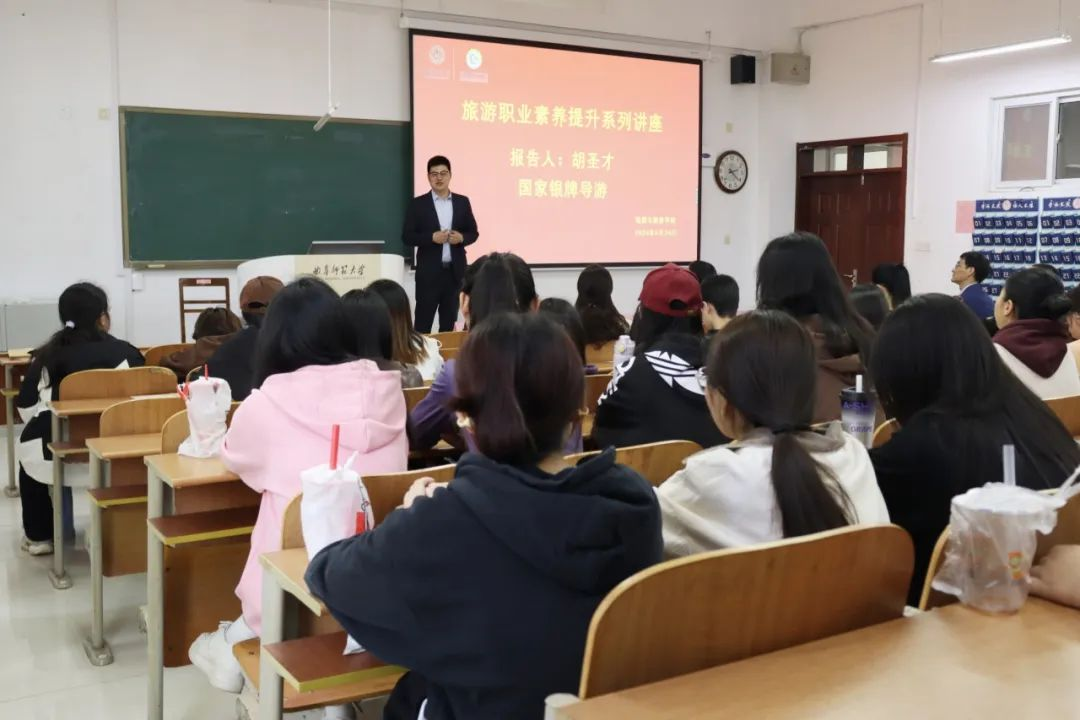 于S406举办旅游职业素养提升系列讲座暨2024年导游服务技能大赛颁奖仪式。讲座邀请到国家银牌导游、日照职业技术学院旅游管理专业老师胡圣才主讲,学院党委副书记刘伟、副院长吴军、旅游管理系教师石峰、谭清月、管理学院教师韩笑出席,旅游管理系教师李梦程主持,“中盛幸福杯”导游服务技能大赛获奖同学、2023级旅游管理专业全体同学参加。