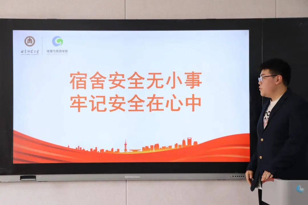 首先,地理科学三班团支书刘闻钊以“宿舍安全无小事,牢记安全在心中”为主题,从起居安全、火电使用、防盗防骗三个方面开展安全主题班会,详细地向同学们讲解相关安全知识和应对措施,提高安全意识。接下来,陈刚也对安全问题提出了几点补充,他着重强调,要加大对电信诈骗的防范意识,避免沉迷网络直播,树立正确的价值观,抓好思想阵地建设。