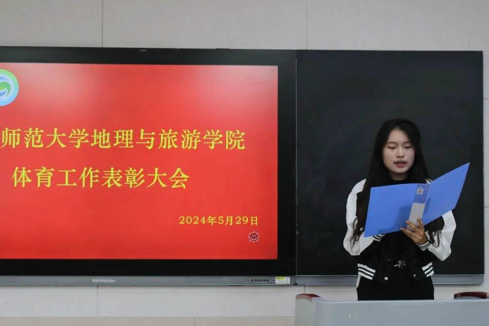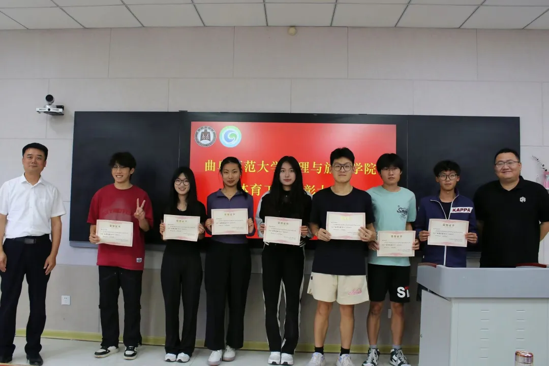 随后,运动员代表裴哲回顾本次运动会精彩瞬间,他强调团结进取、奋勇拼搏是取得优异成绩的良方,并对学院的大力支持和老师的辛勤付出表示感谢。贾志浩作为球队代表,以他所在的地理男排队为例,分享球队的建设及管理经验。他表示,建立起一个积极向上的队伍,需要球队所有成员明确目标,同心协力,坚持训练,超越自我。郭兴哲宣读表彰名单,鼓励受到表彰的同学珍惜荣誉、再创佳绩。刘伟、陈鑫分别为获得“体育之星”“体育先进个人”“体育先进集体”等奖项的先进集体和个人颁发荣誉证书并合影留念。最后,李欣瑞总结近期体育工作,肯定近期工作佳绩,提出不足和问题,并对未来工作作出规划。