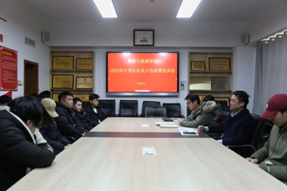 于会馆2401举办2025年大学生征兵入伍政策宣讲会。学院党委副书记刘伟,2021级辅导员田青出席,2021级部分学生参与。