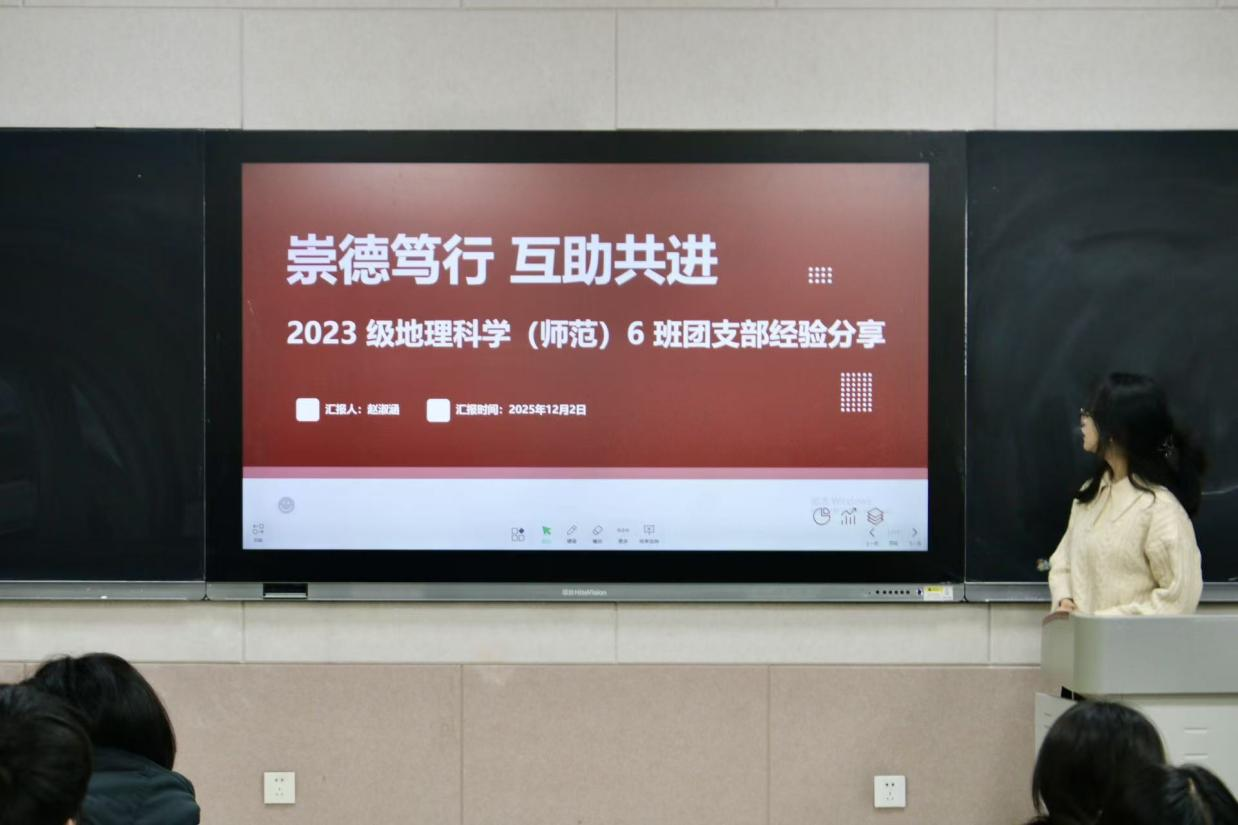 随后,2024—2025学年优秀团支部成员代表、2023级地理科学6班团支部书记赵淑涵分享支部建设经验,为各团支部工作开展提供了优秀的参考范例。她介绍道:自己所在支部以“崇德笃行、互助共进”为核心理念,以思想引领为魂、制度保障为骨、互助共进为脉,通过构建“以赛促学、以活动凝力、以服务铸魂”的良性循环模式,依托学院团委书记全方位指导、班级团干部示范带头、全体成员积极参与的联动机制,推动团支部综合发展提质增效。