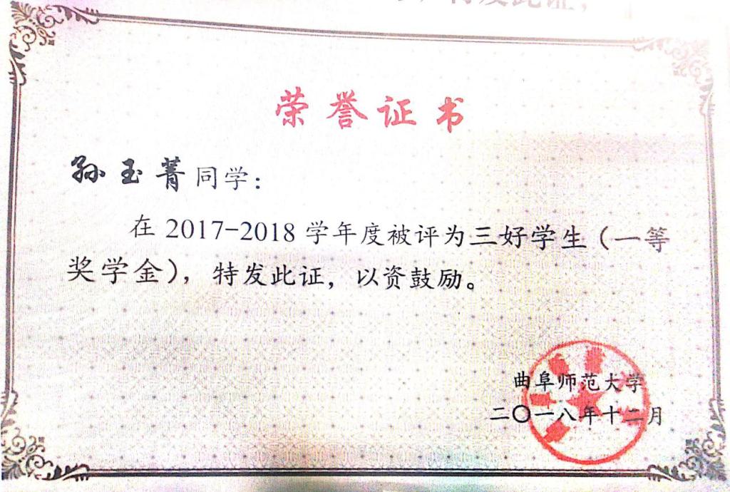 孙玉菁,中共党员,2017级地理科学3班团支书。连续三年获得一等奖学金,曾获2019 年全省大中专学生志愿者暑期“三下乡” 社会实践优秀学生、省级“优秀师范毕业生”、“优秀学生干部”、“优秀团干部”、“五好学生标兵”、“十佳团支书”、大创省级立项、山东省创业计划大赛省级三等奖等。