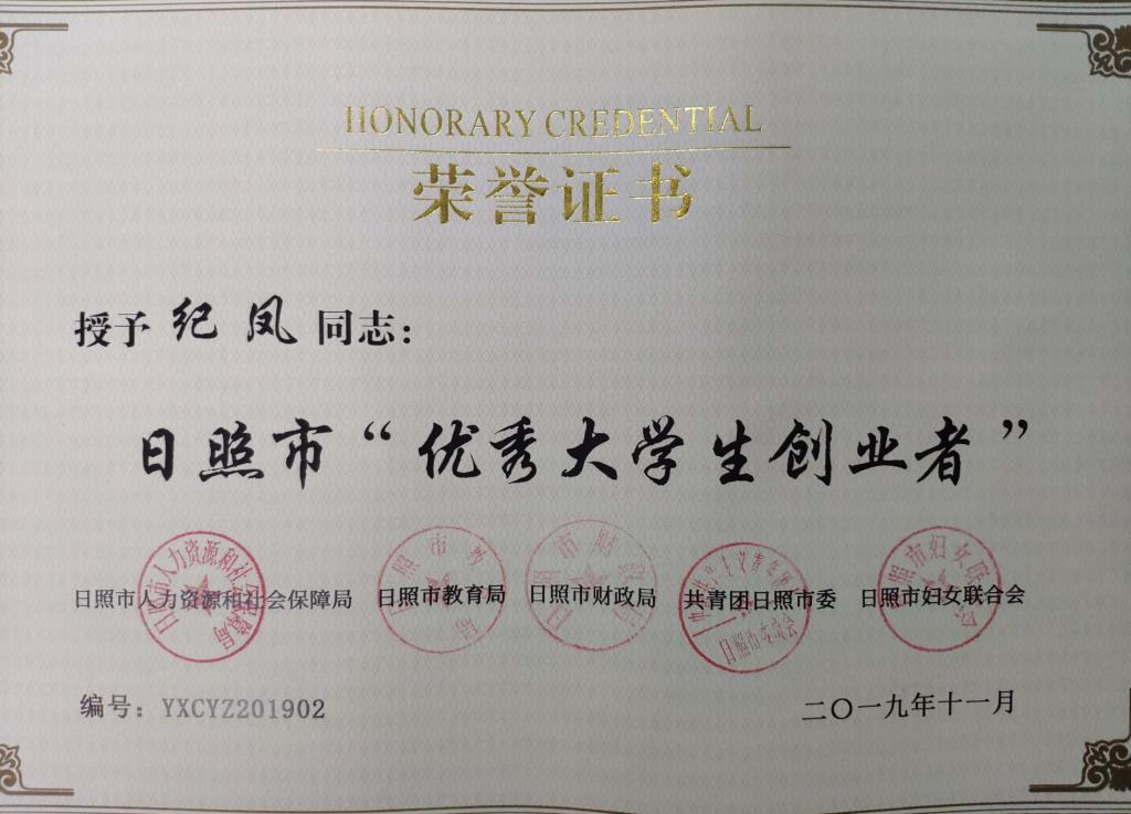 2019.11,日照市大学生创新创业大赛,获“优秀大学生创业者”称号