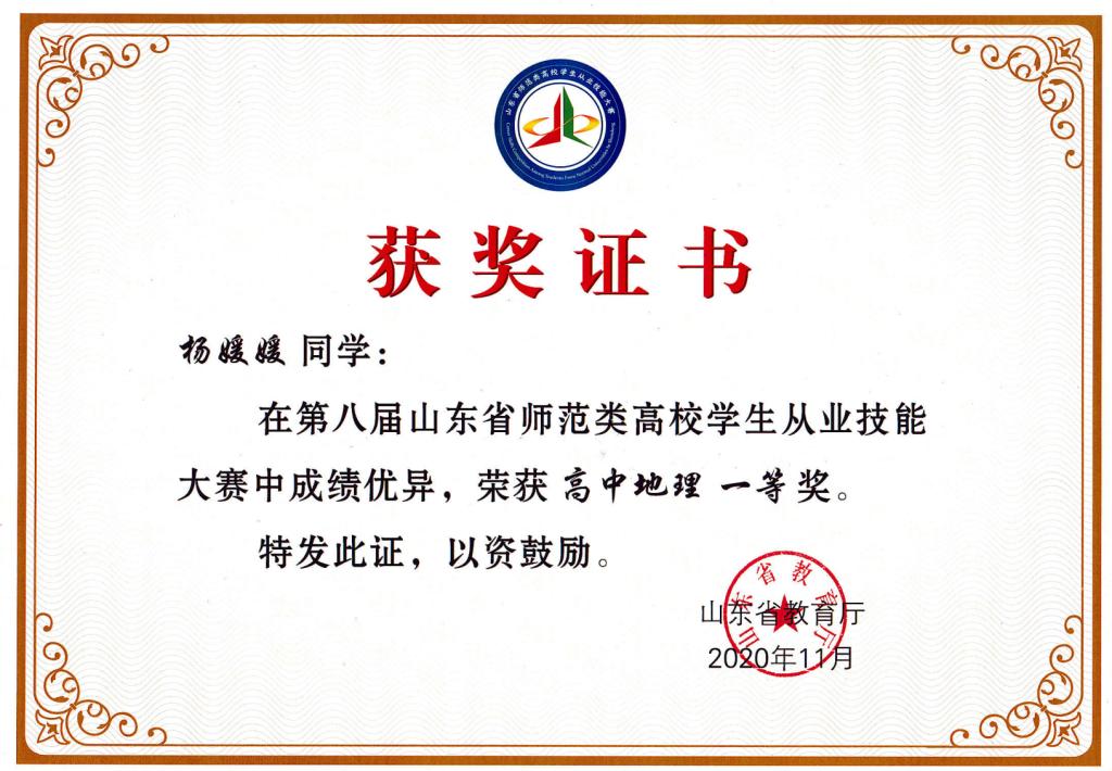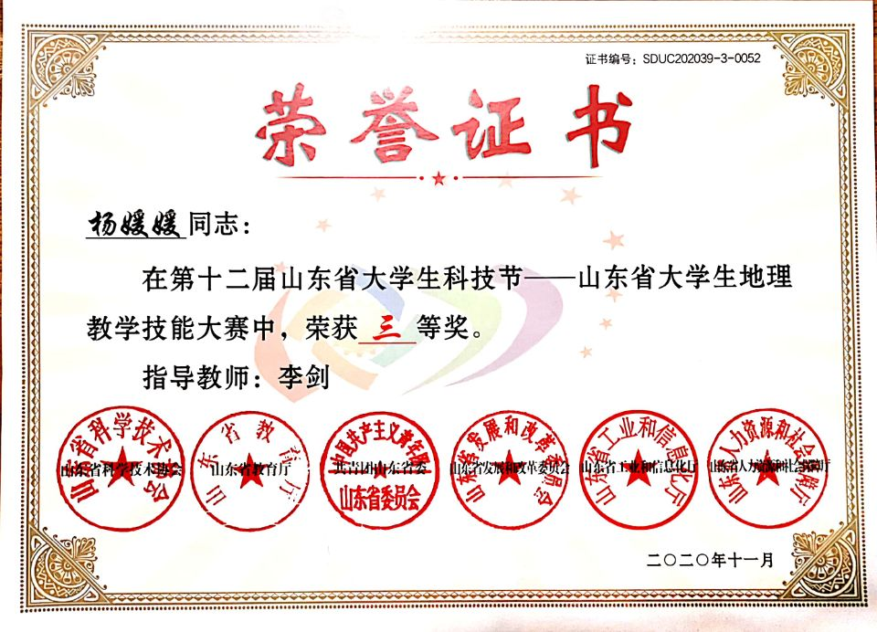 在专业技能方面,第八届山东省师范类高校学生从业技能大赛一等奖,十二届山东省大学生科技节地理教学大赛三等奖,麻豆在线
