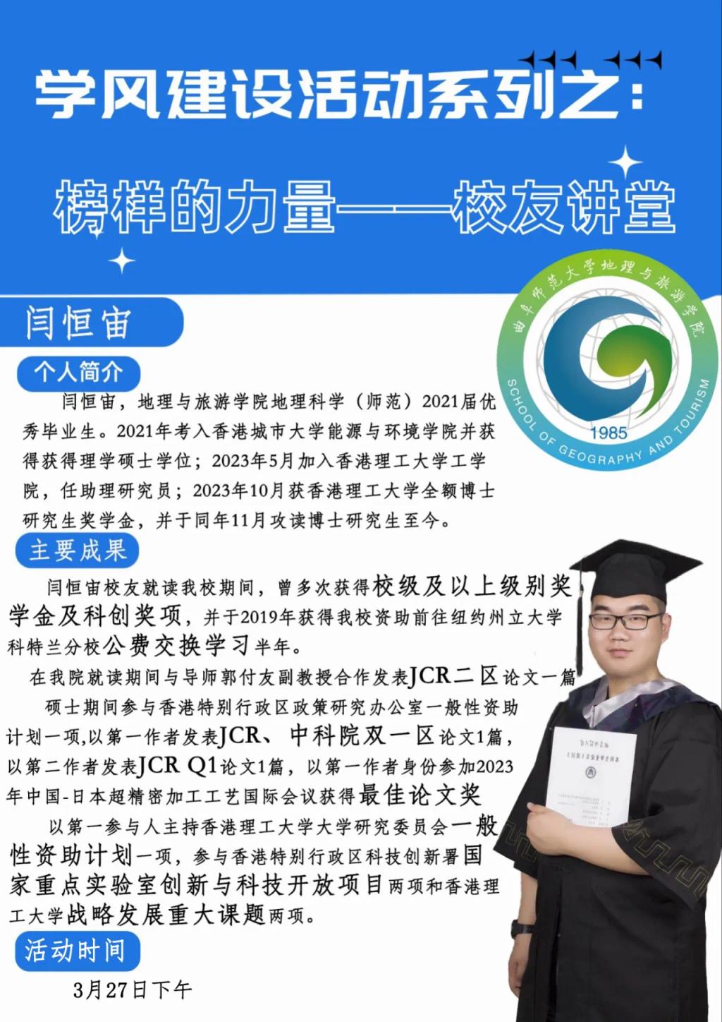 为助力学院学风建设,推进本科教育教学思想大讨论走深走实,3月27日,麻豆在线 于S206举行“榜样的力量——校友讲堂”第二讲。本次讲座邀请了麻豆在线 2021届地理科学专业优秀毕业生、现于香港理工大学攻读博士研究生的闫恒宙主讲,学院党委副书记刘伟出席,2022级、2023级同学积极参加。