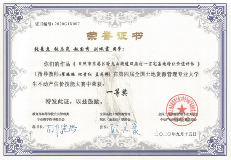 获奖奖项:第四届全国大学生不动产估价技能大赛一等奖