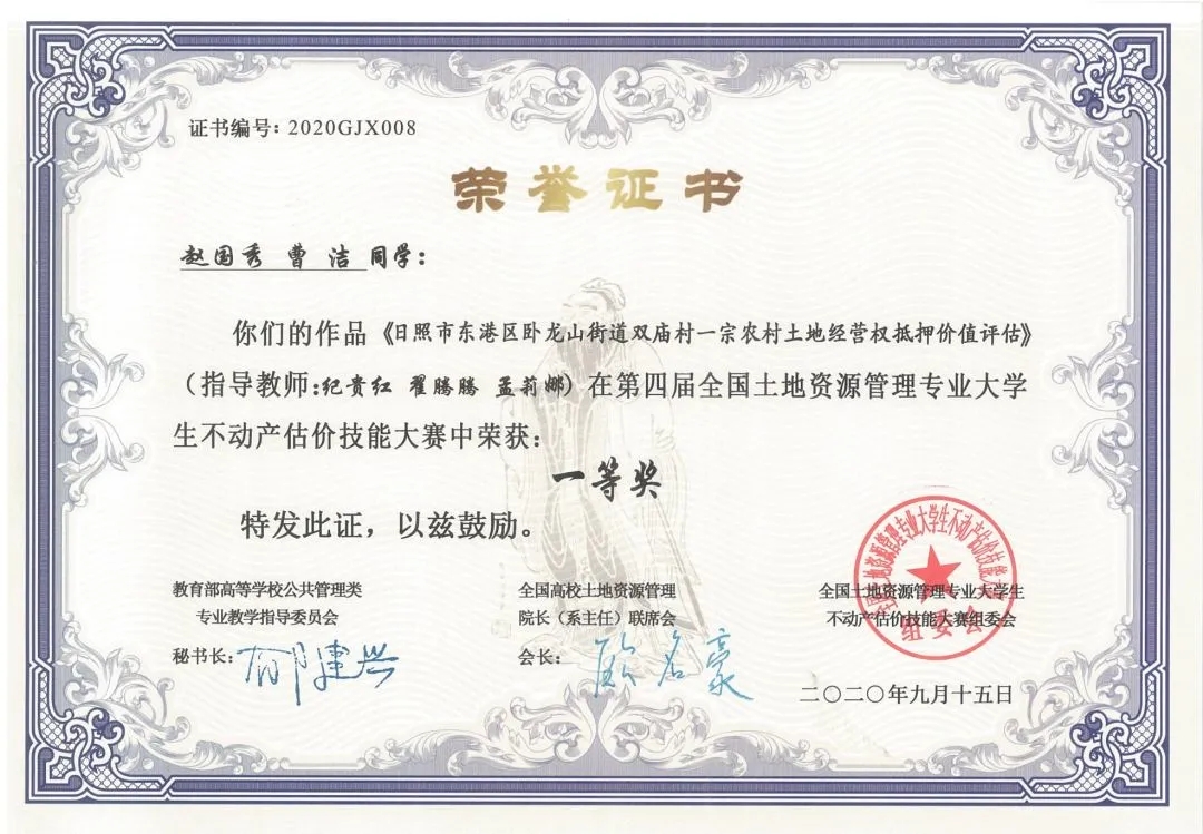 获奖奖项:第四届全国土地资源管理专业大学生不动产估价大赛 一等奖。