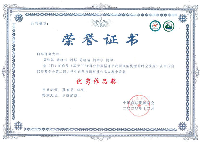 获奖奖项:中国自然资源学会第二届大学生自然资源科技作品大赛 优秀作品奖