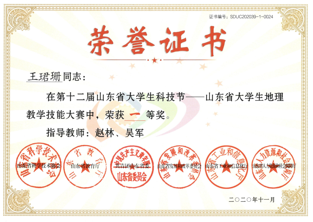 获奖情况2020年山东省大学生地理教学技能大赛一等奖