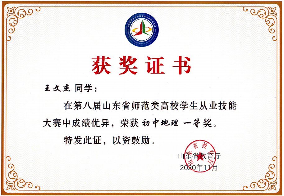 获奖情况: 第八届山东省师范类高校学生从业技能大赛初中地理推荐组一等奖