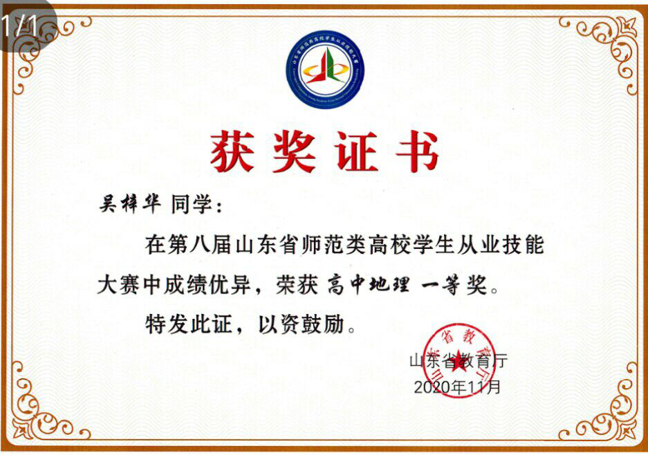 获奖情况:第八届山东省师范类高校学生从业技能大赛高中地理一等奖