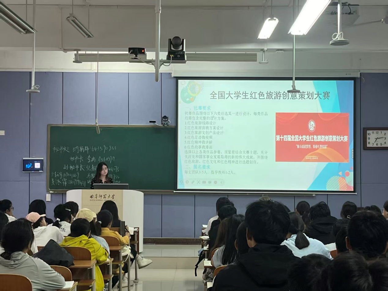 会上,科技创新部部长及副部长结合地理科学、旅游管理等专业特点,对A1类、A2类及其他各类赛事展开详细介绍。会中重点解析了中国国际大学生创新大赛、“挑战杯”全国大学生课外学术科技作品竞赛、“挑战杯”中国大学生创业计划大赛、中国高校地理科学展示大赛、全国大学生地质技能竞赛等各类竞赛的赛道设置、团队组建要求与评审标准,并详细介绍各类比赛的备赛要点、作品申报规范与奖项价值,借助往届案例,为新生梳理从选题构思到成果打磨的全流程方法。