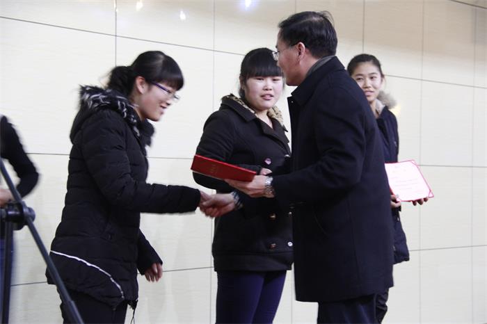 党总支副书记杨兴防致推荐词后,2012级专业第一名学生张琳林,卞慎芳和纪娜同学依次登上主席台,发表获奖感言,党总支书记胡长春为她们颁发明星学子荣誉证书,并合影留念。