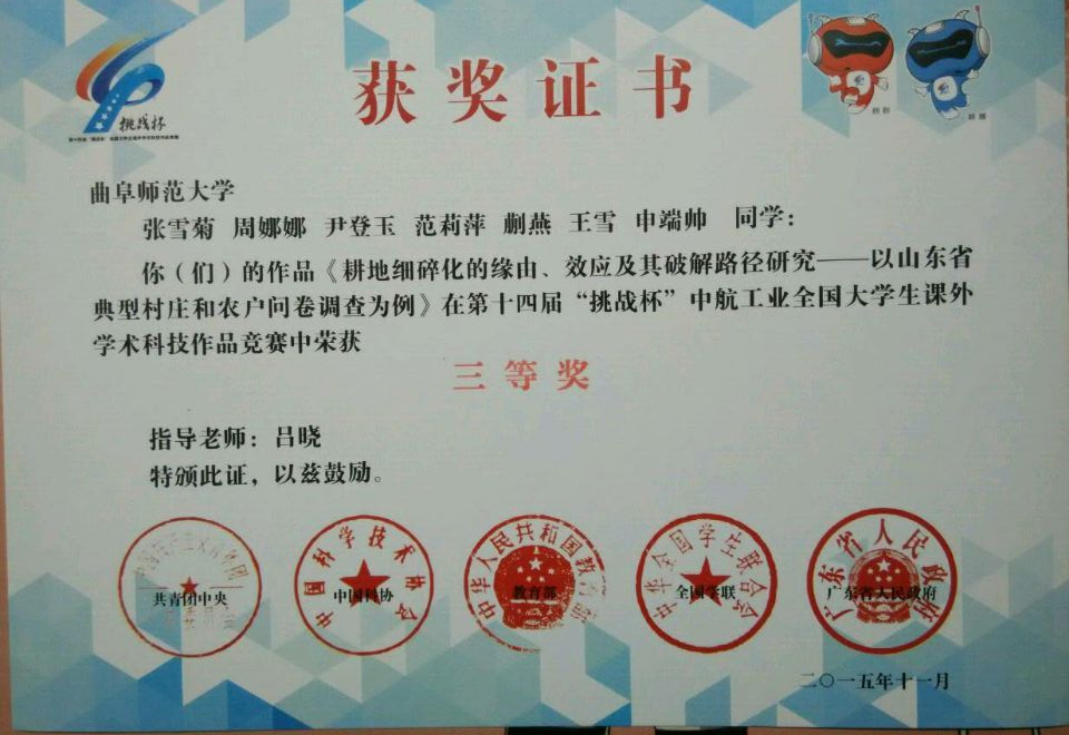 11月20日,第十四届“挑战杯”全国大学生课外学术科技作品竞赛决赛在广东工业大学落下帷幕,麻豆在线 选送的由吕晓老师指导、张雪菊、周娜娜、尹登玉、范莉萍、蒯燕、王雪、申端帅参与完成的经济类作品《耕地细碎化的缘由、效应及其破解路径研究——以山东省典型村庄和农户问卷调查为例》荣获三等奖。