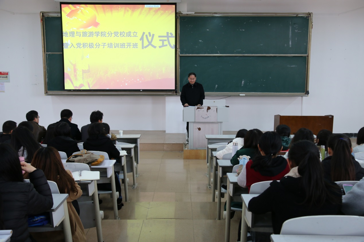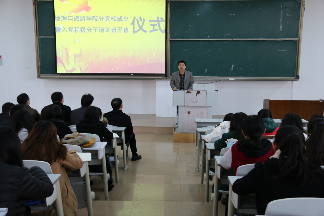 党总支书记胡长春代表学院讲话,他强调,成立地理与旅游分党校是贯彻3月31日学校党建工作会议精神的要求,学院分学校是对大学生入党积极分子进行马克思主义理论教育和中国梦教育的重要载体和平台,学院分党校的成立是学院加强党建工作的重要举措。