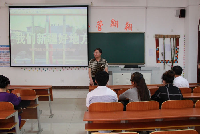 胡长春书记来到会场就和大家聊起了天,他在讲话中强调,今年是新疆维吾尔自治区成立60周年,新疆60年的发展取得了巨大的成就。他说曾经去过新疆,那里丰富的物产和别样的风景给他留下了深刻的印象。他表示他对新疆肯定没有同学们了解,他这次来就是和同学们来一起学习新疆,一起了解新疆。杨兴防副书记在发言中希望同学们和汉族同学搞好团结,努力学习,并询问大家生活和学习上有无困难。会上,大家一起学习了“我们新疆好地方”电子月刊。校学生会副主席、2012级新疆籍同学迪力木拉提结合学习材料,向同学们介绍了新疆在教育、科技、社会经济各方面取得的发展成就。他表示新疆正在大力发展双语教育,而这些就需要像同学们这样受过高等师范教育的人才。他在交流会中还向同学们介绍了 “一带一路”倡议并向同学们展示了新疆飞速发展的经济形势,他相信,只要经济发展了,解决好就业问题,搞恐怖活动的暴徒就没掀不起风浪,最后他总结道“只有民族团结才能促进新疆更快更好发展。”