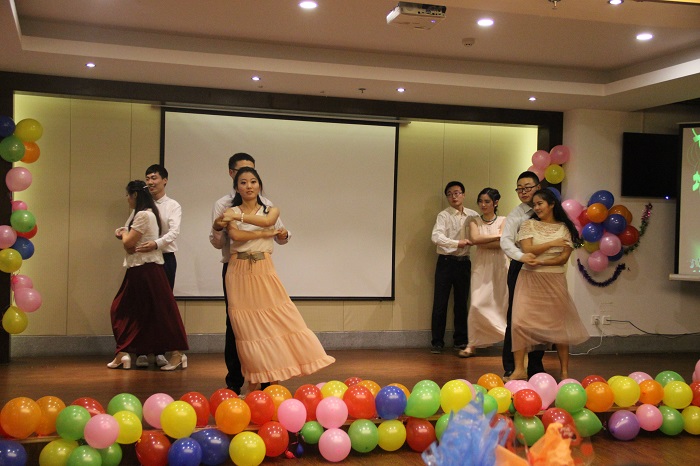 晚会节目不仅是中外的融合,更有古今的汇聚。同学们用古老的三句半形式,幽默的讲述了曲园生活的酸甜苦辣,语言凝练幽默不时引爆台下同学的笑点;小品和音乐剧院更是显示了同学们的演绎才能。院领导也纷纷上台,献上节目与师生共享新年祝福,胡书记一首《再别康桥》带领我们回到了雾都伦敦的剑桥,他富有磁性的嗓音,吸引大家屏气凝神进入唯美的诗歌世界。谢院长引吭高歌一曲豪迈的《下马酒》,将晚会推上新的高潮。结束总在欢笑后,随着优美的舞曲和优雅的舞步研究生新年晚会也接近尾声。