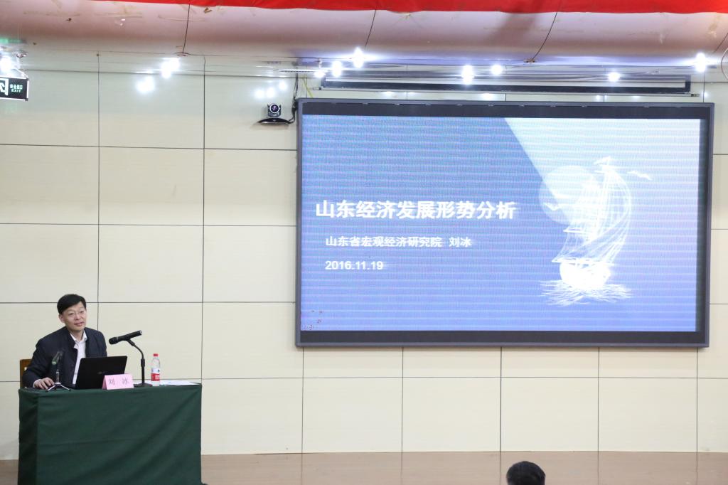 刘冰教授作了题为“山东省宏观经济形势分析”的报告。报告中刘教授从《经济观察报》是的一篇文章《财富焦虑那一端闪耀着财富创造的火花》谈起,解读了走在全国前列的山东经济现状,分析了山东省当前经济发展形势,指出山东省经济未来发展的重点是:稳增长、补短板、增优势、上水平、防风险和惠民生。