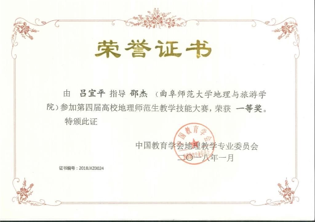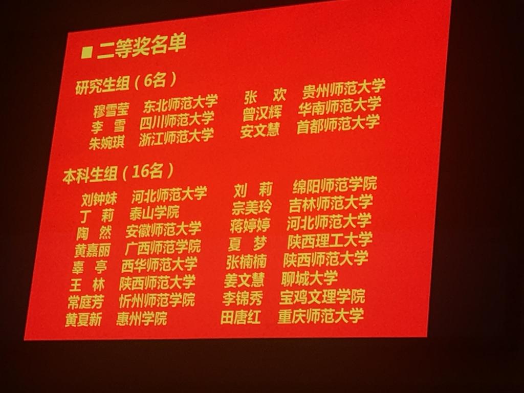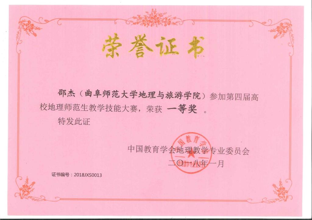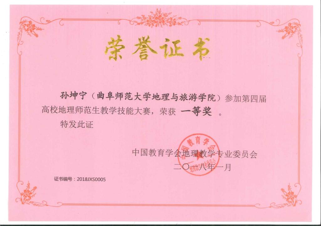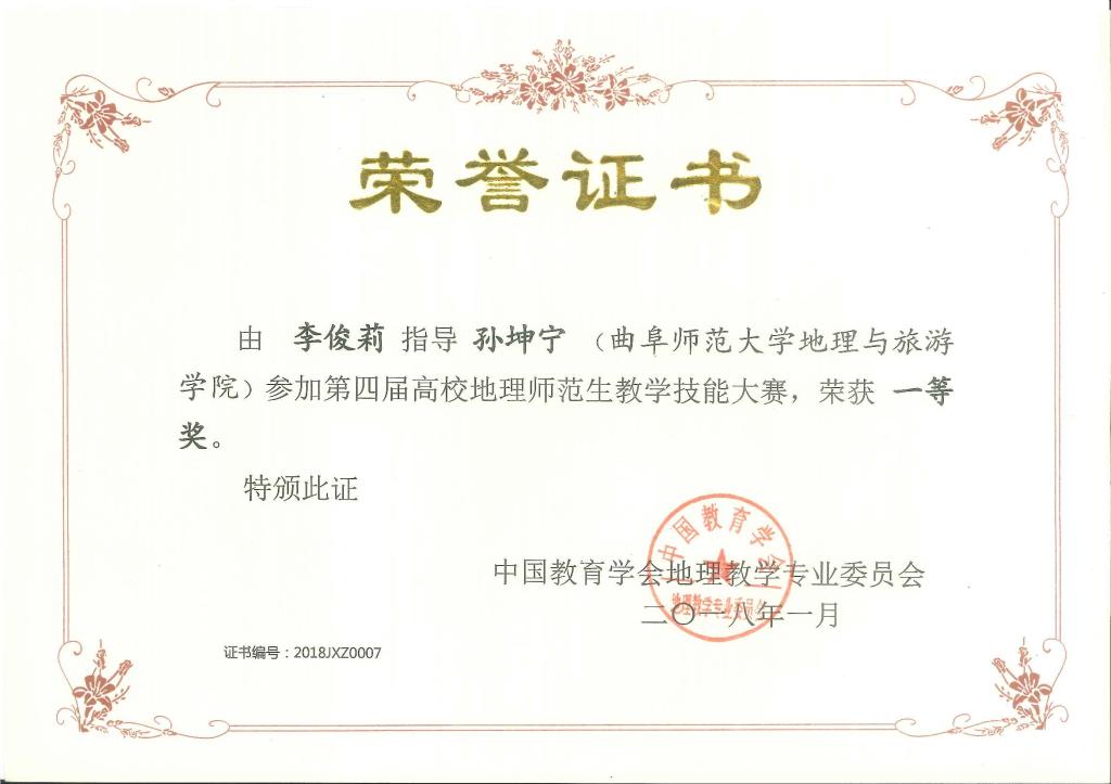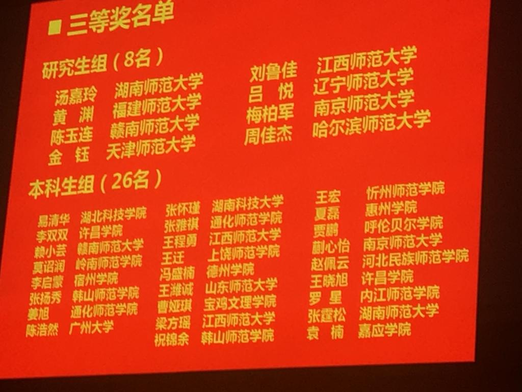 1月5日-7日,由中国教育学会地理教育专业委员会主办的第四届全国高校地理师范生教学技能大赛在浙江师范大学举行。我校派出参赛选手研究生孙坤宁、本科生邵杰在李俊莉老师和李剑老师的带领下,分获本科生组和研究生组一等奖,李俊莉、吕宜平两位指导老师荣获优秀指导教师奖。我校成为全国唯一一所同时荣获本届比赛研究生组和本科生组两项最高奖项的高校,并与西南大学、上海师范大学一起成为三强学校。孙坤宁同学还作为优秀选手代表,在1月7日举办的全国“基于新时期专业素养提升的卓越地理教师培养”研讨会上作了交流展示。