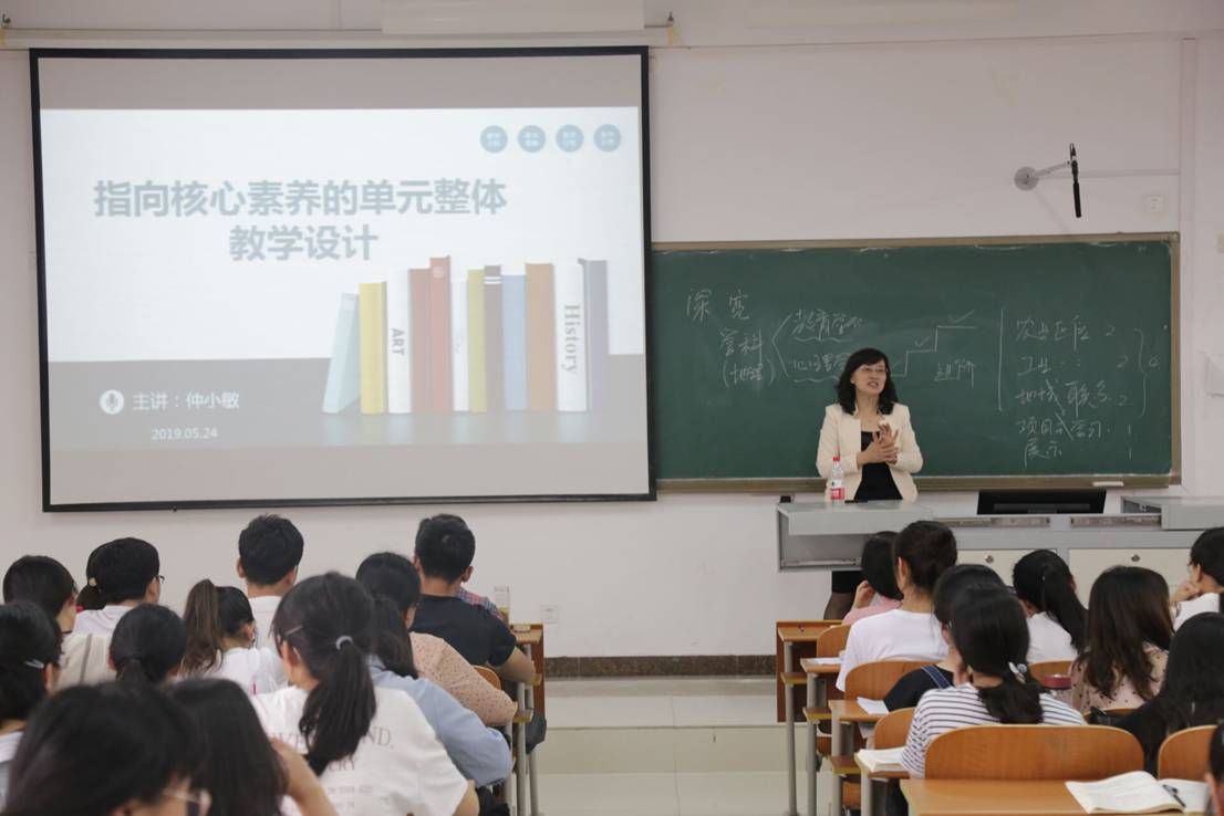 “经纬讲堂”之高端论坛——“指向核心素养的单元整体教学设计”学术报告会于JS414成功举办。天津市教学名师、天津师范大学教师教育学部副部长仲小敏教授担任主讲人。报告会由学院教授委员会主任代合治教授主持,廉丽姝、刘艳、李剑、贾维花、谭丽荣、纪贵红、秦霞、孙丕苓、侯爱玲等相关专业教师、研究生和本科生共一百余人参加了报告会。