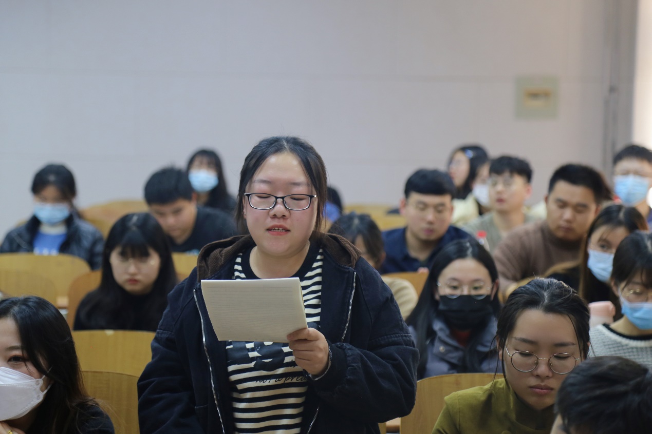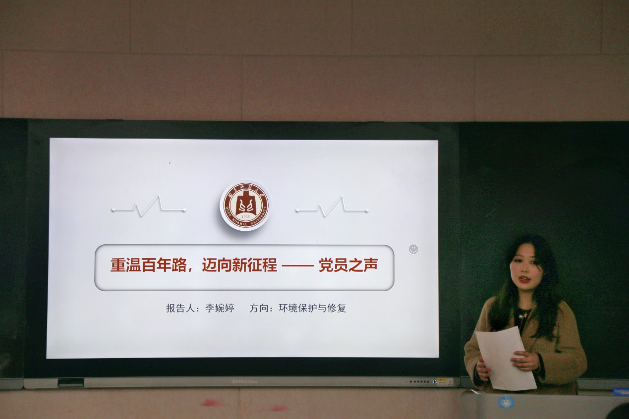 回顾党史,我们发现宝贵历史经验弥足珍贵,回顾校史,我们觉醒优秀模范就在身边。辛媛同志作为本次活动第三部分“党史与校史”的主讲人,为大家讲述了薛其坤院士的优秀事迹,“努力总会有收获,艰苦会带来幸福”是薛其坤在演讲时所说的,只要勤奋,执着,专注就会有收获,天才总是极少数人,薛其坤院士不过是比更多普通人付出了更多的努力,保持对梦想的初心,一步一个脚印地迈,才获得了如此大的成功。