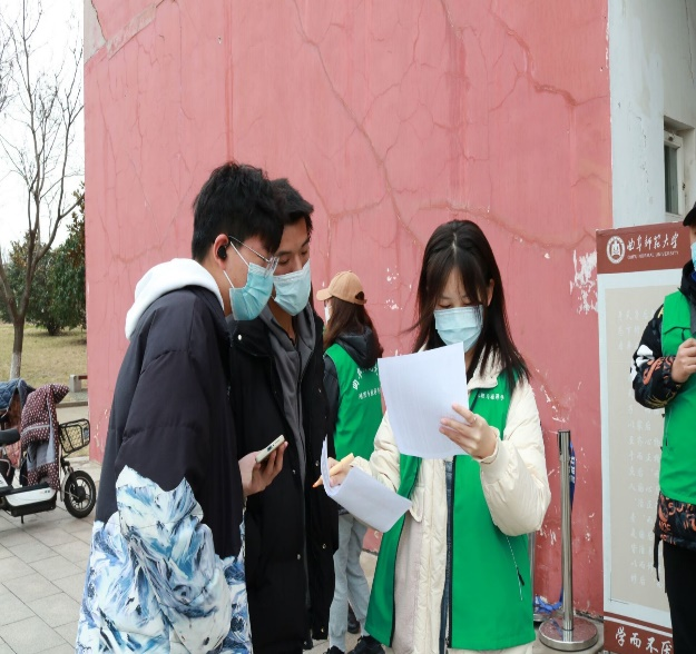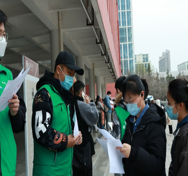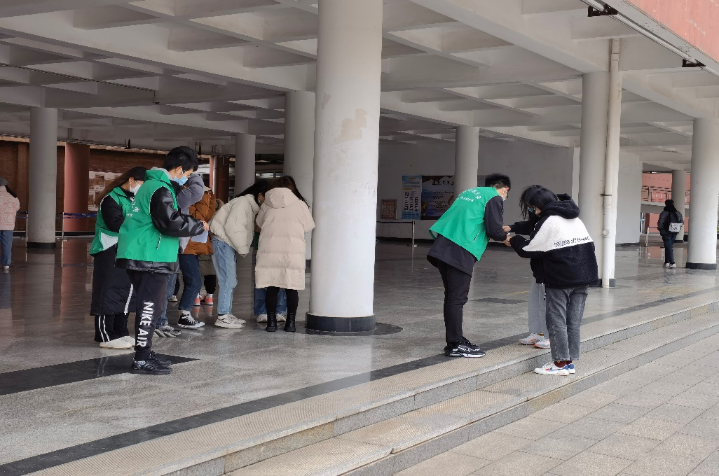 近日气温骤降,多名志愿者在寒风中积极组织同学们有序进行核酸检测。虽寒风瑟瑟,但志愿者们仍以极大的热情为同学们能够高效进行核酸检测而努力,在检测地点入口处为同学们服务。