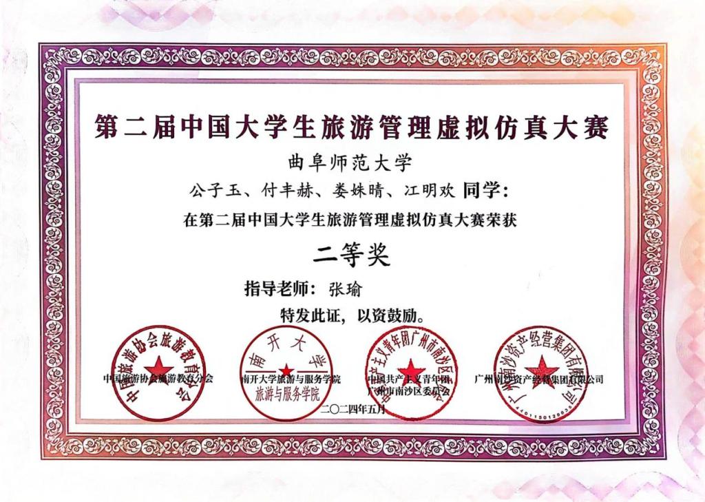 大赛旨在落实党中央提出的“把论文写在祖国的大地上,把科技成果应用在实现现代化的伟大事业中”实践指南。自2024年1月以来,全国各地高校积极响应。两岸三地共有163所高校、526支队伍参赛、近3000名青年学生参与。经过初赛一个月的激烈角逐后,南开大学、澳门旅游大学等224支队伍成功晋级决赛。决赛以虚拟仿真电子竞技和旅游项目实践策划相结合的形式进行。由张瑜副教授指导的公子玉、付丰赫、娄姝晴、冮明欢团队,在旅游酒店企业虚拟仿真经营实验中,经过多个回合的数据分析和战略决策,取得优异的累计投资回报率;在旅游项目实践策划环节,团队以广州特色的海上丝绸之路文化为依托,出色完成了“海丝文化亲子民宿项目”策划方案,受到参赛师生和专家评委好评,获大赛二等奖。