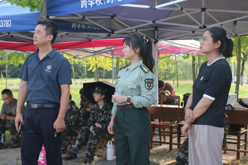 党委副书记刘伟和辅导员张乃宁、公惟莹观看同学们军训情况