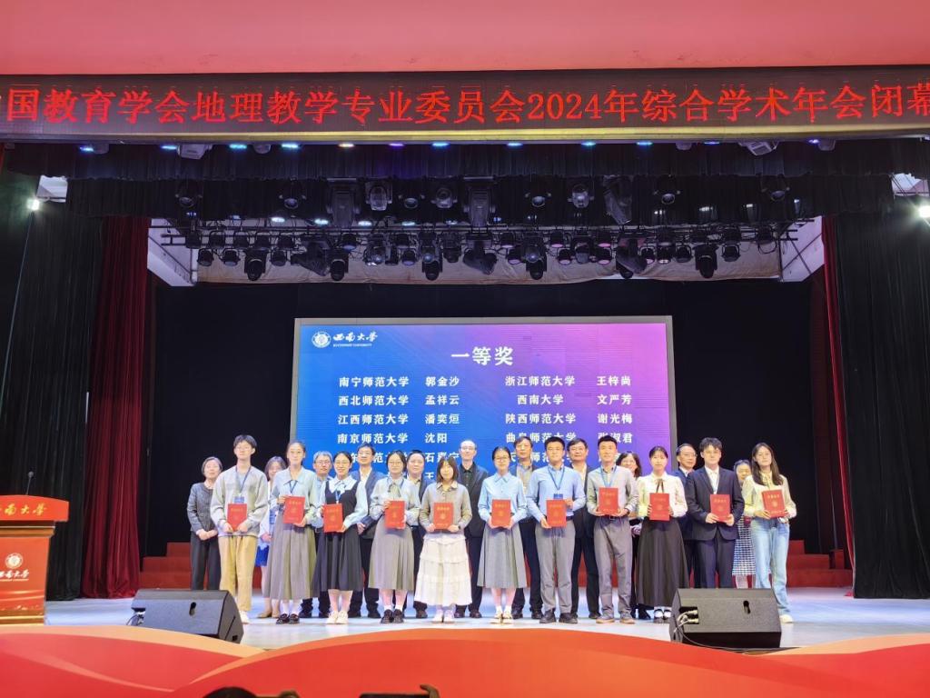 参赛师生在颁奖仪式现场合影(左八为中国教育学会地理教学专业委员会理事长段玉山教授)