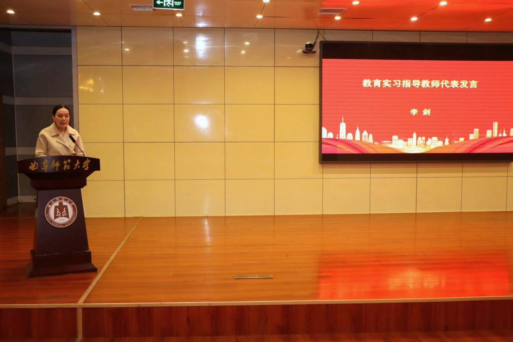 ,李剑老师代表教育实习指导教师发言。她提出教育实习是师范生培养的重要环节,是理论与实践结合的最好平台。纸上得来终觉浅,绝知此事要躬行,希望同学们把握好机会,在实践中学习和巩固理论知识,在教育实习中积累教学和社会经验,努力提升自身的专业素养和教学能力。她希望同学们牢记学高为师、身正为范的师训,服从学院与实习学校的管理,严格要求自己,虚心听课,精心备课,积极试讲,认真授课,做好学生到教师的角色转换,以教师的高标准严格要求自己。