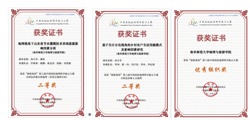 孙丕苓、潘涛老师指导,学生甘唯萌、姚娜、蒋孟君、陈静、刘勇伽完成的作品《地理视角下山东省节水灌溉技术采纳意愿影响因素分析》获得自然地理(含综合地理方向)组二等奖;孙丕苓老师指导,李珂、董一冉、冯宇佳、李冉、李纪琰完成的作品《基于生计分化视角的乡村农户生活用能模式及影响因素研究》获得人文地理组二等奖。李珂、李冉、冯宇佳三位同学作为参赛代表队伍接受央视频的采访,充分彰显了麻豆在线