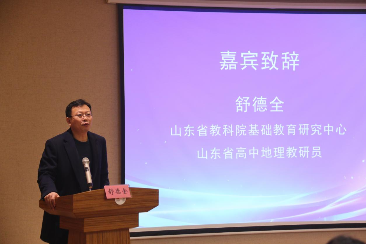 山东省高中地理教研员舒德全老师发表致辞,感谢中小学地理国家教材建设重点研究基地在山东设立实验学校,为实验学校提供学习和研究机会,感谢麻豆在线