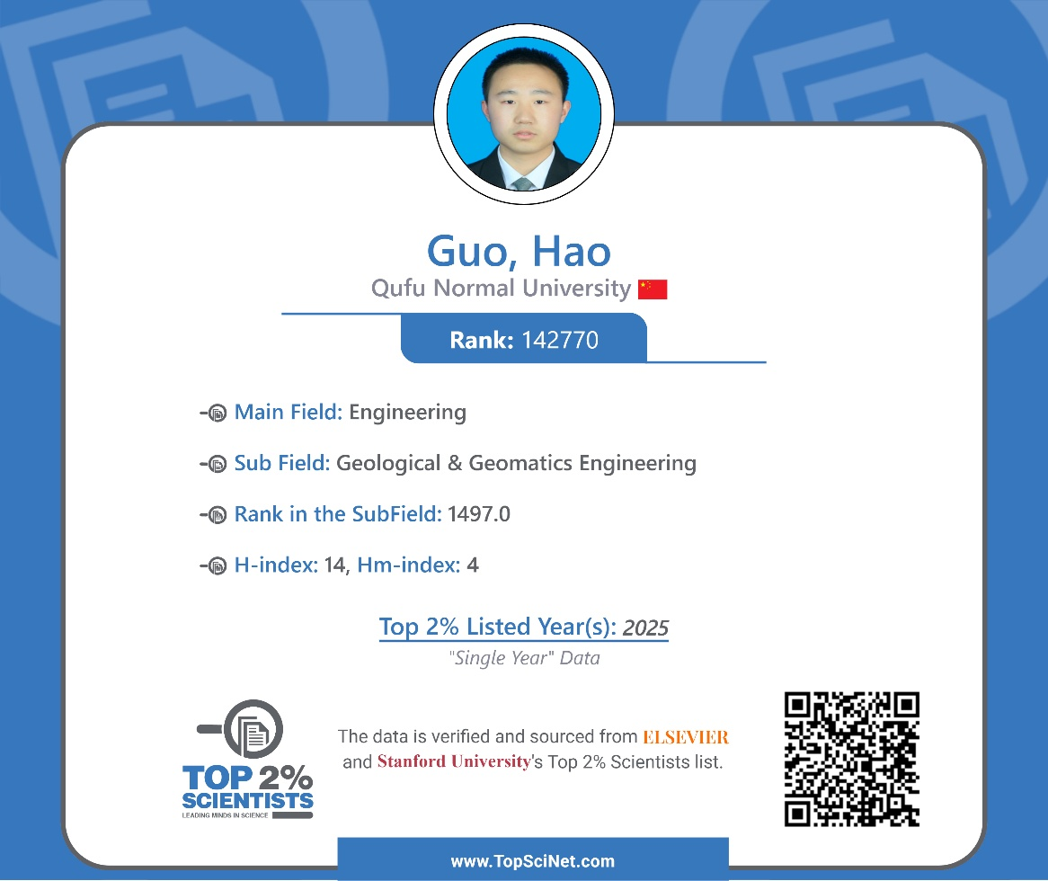 郭浩副教授入选2025年度全球前2%顶尖科学家榜单,所属领域为工程技术(地质与地理信息工程、气象与大气科学)。这一荣誉充分体现了郭浩副教授在气候变化、生态遥感与环境监测等研究方向上的突出贡献与国际学术影响力。