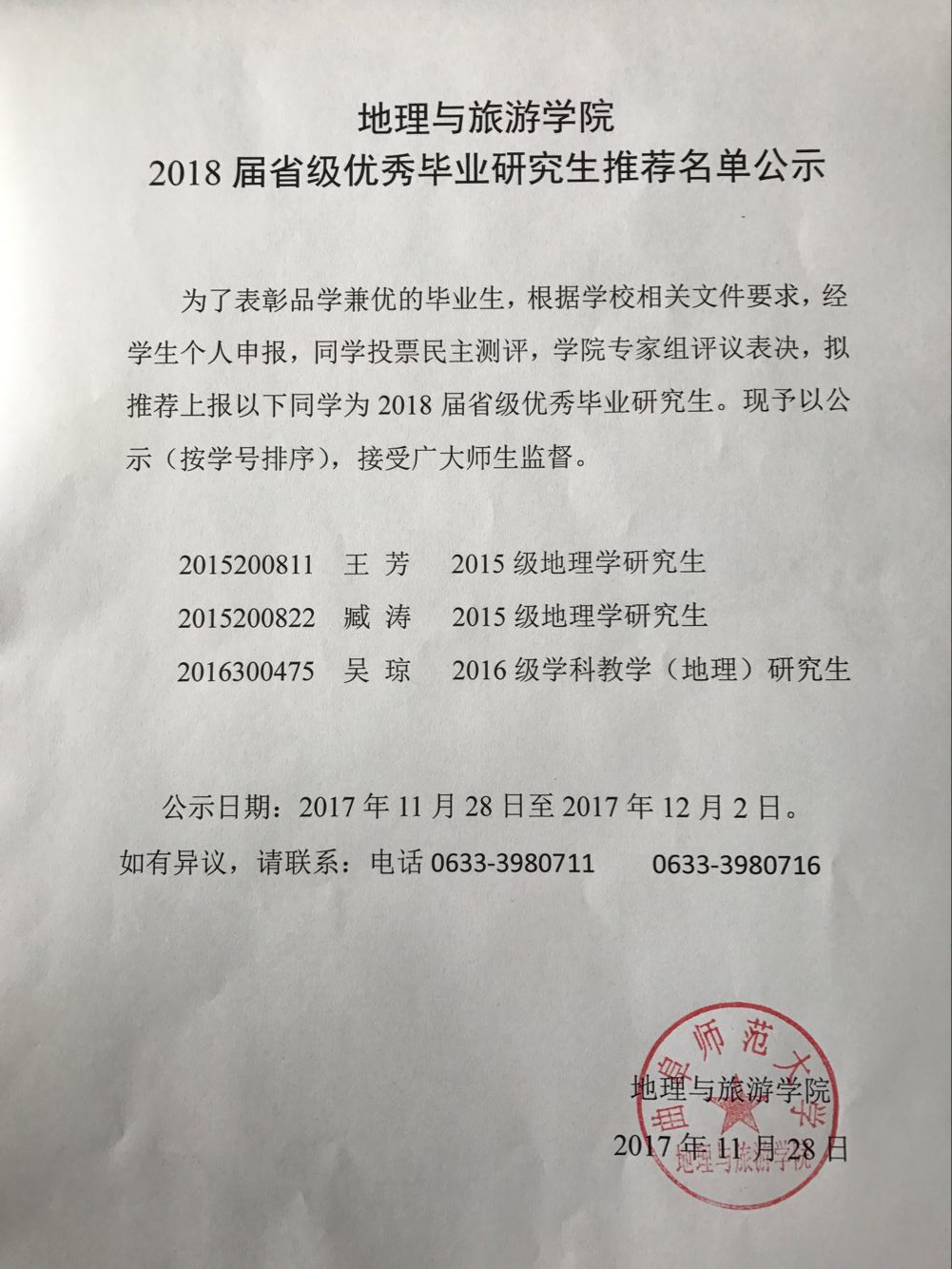 2017年度山东省高等学校优秀学生、优秀学生干部推荐名单公示