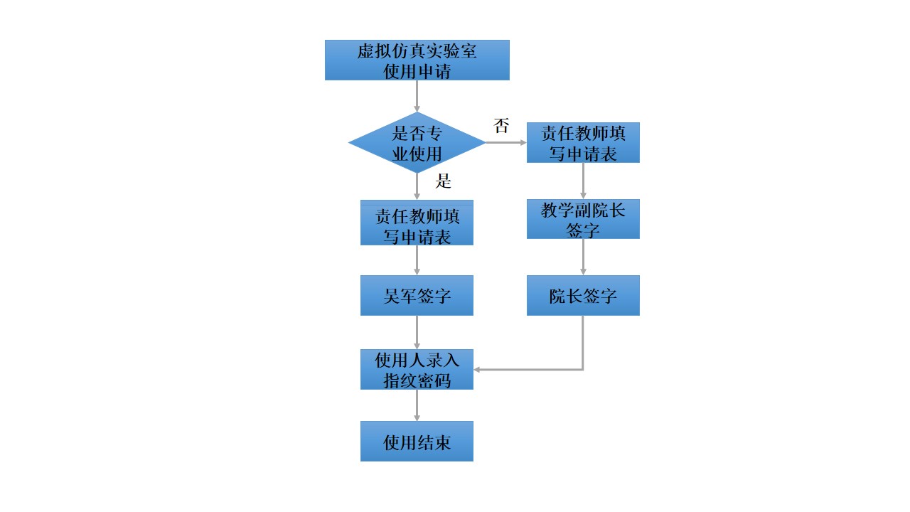 同时,为确保实验室的充分利用,实验室也面向校级以上大型活动开放使用,使用申请需经过院长和教学副院长同时审批方可使用,具体流程见下图,申请表见附件。